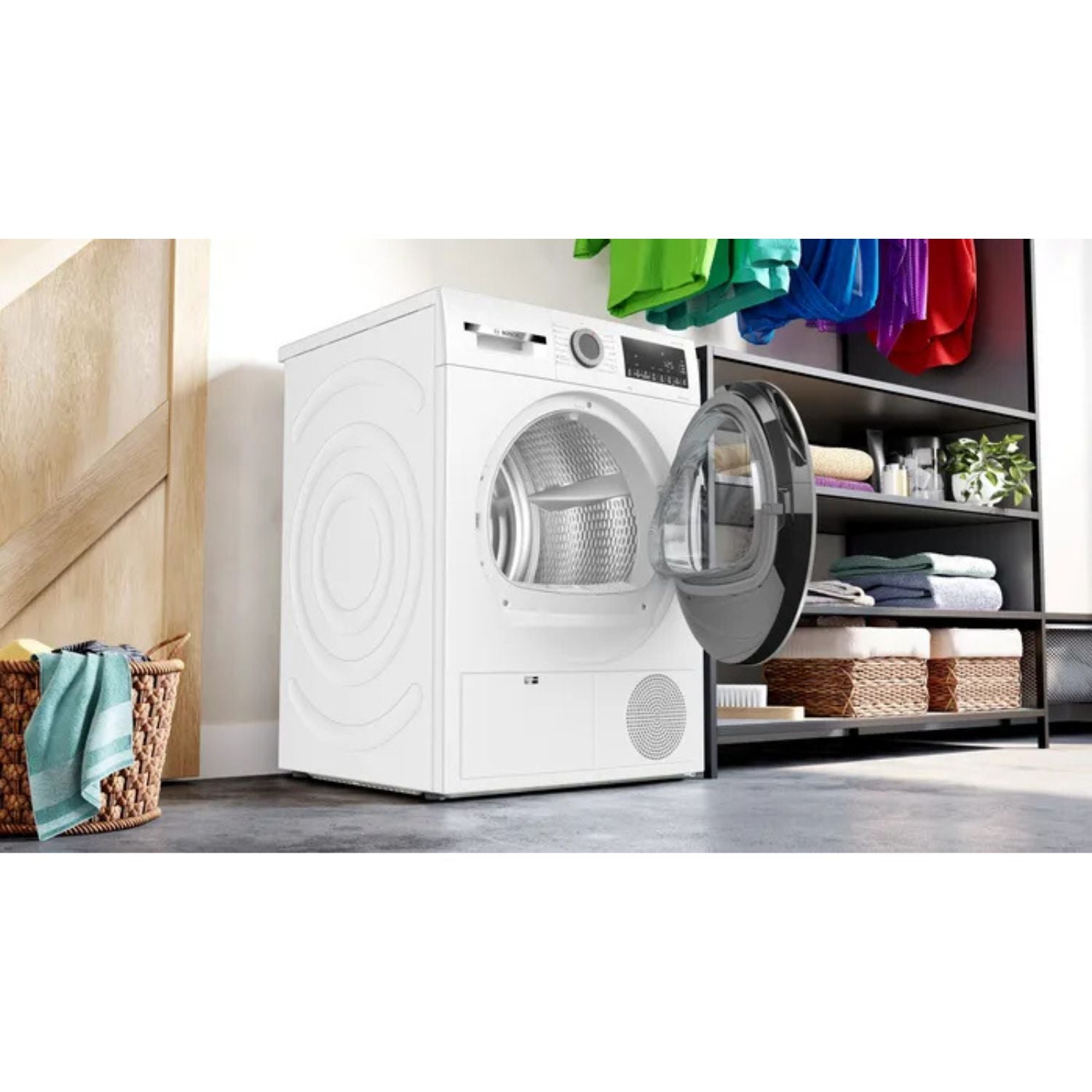 The Bosch WQG24200SG is a 9 kg heat-pump tumble dryer designed for energy-efficient, fabric-friendly drying. Its advanced heat-pump technology uses warm air instead of traditional heating elements, cutting energy consumption while gently drying clothes. The SensitiveDrying system and automatic anti-crease cycle help minimize wrinkles and protect your garments’ fibers — ideal for delicate clothes, towels, woolens, down wear, or mixed loads. A comprehensive set of programmes (cottons, synthetics, delicates, sportswear, down, wool finish, and more) plus quick 40-minute drying for light loads adds flexibility and convenience. With a user-friendly LED touch display, options like delayed start, half-load drying, low-heat mode for delicate fabrics, and easy-clean filter make it a smart, reliable solution for everyday laundry drying needs.