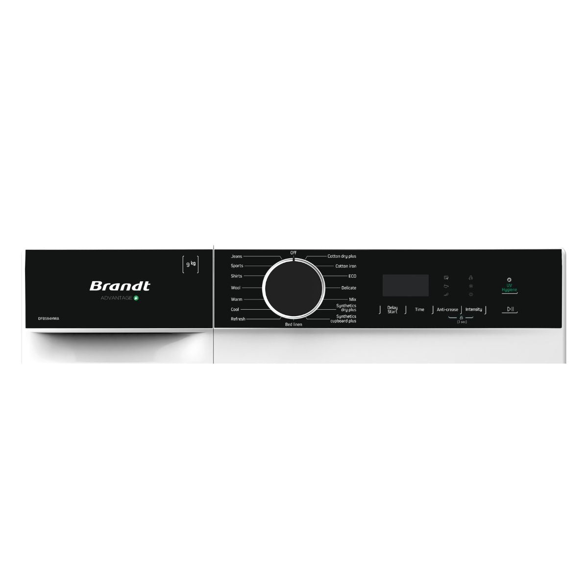 The Brandt DFB594HWA 9 kg front-load heat pump dryer utilizes energy-efficient heat pump technology and an inverter motor to deliver gentle, effective drying. It features UV Hygiene Care and intelligent fabric sensing, as well as a full-colour touch display, drum lighting, and maintenance indicators, making it a smart solution for hygienic and convenient drying.