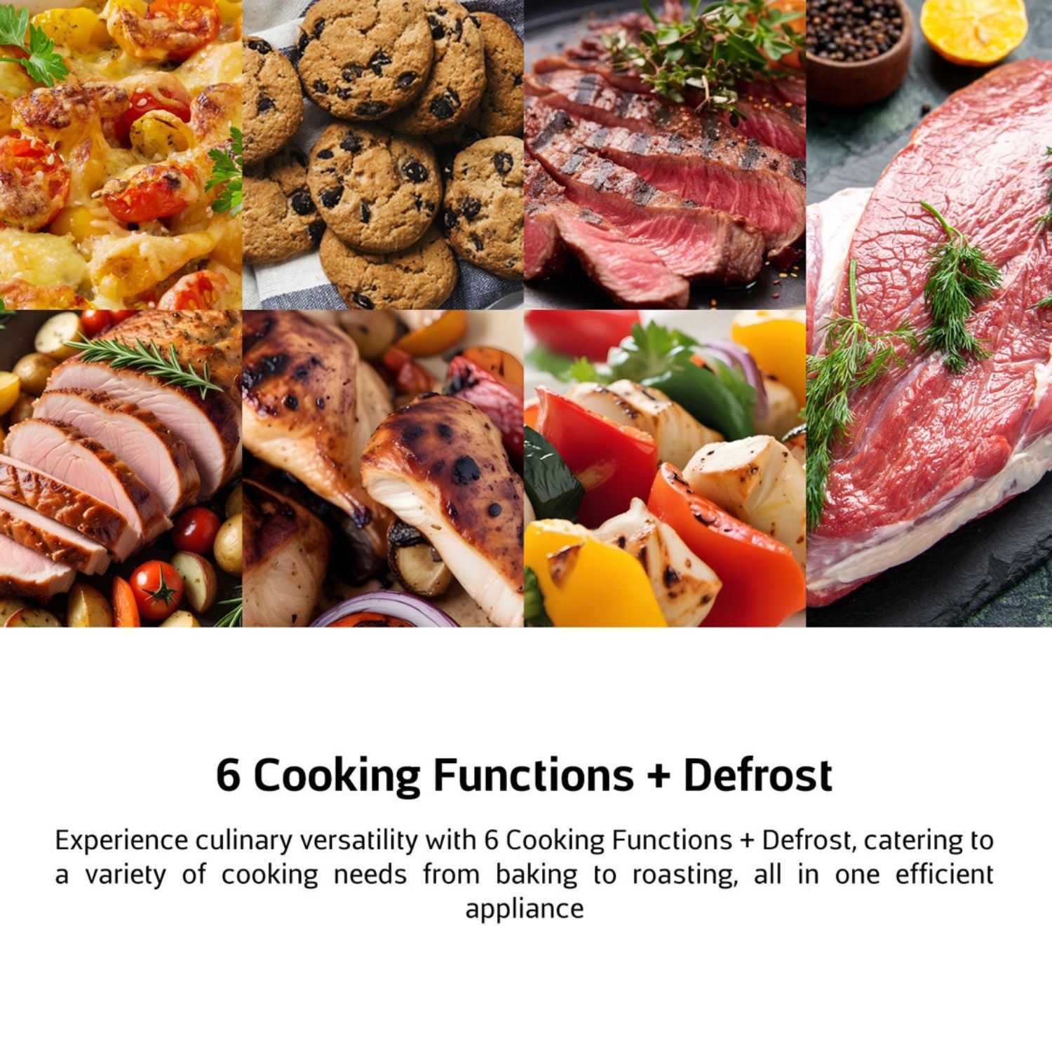 Functions: Defrost, Grill, Double Grill, Double Grill with Fan, Bottom Heat, Top and Bottom Heat, Top and Bottom Heat with Fan
