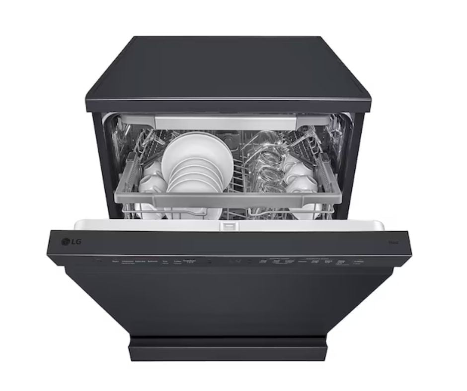 The LG DFC425FM is a 14-place-setting full-size dishwasher in sleek matte-black finish, the LG DFC425FM blends powerful cleaning with smart convenience. It uses QuadWash™ multi-directional spray arms for thorough water coverage, and TrueSteam™ cycles to break down food residue, reduce water spots, and sanitize dishes. The Inverter Direct Drive Motor delivers quiet, efficient operation, while SmartRack™ Plus gives flexible rack configurations to fit everything from plates to tall pots. With ThinQ™ Wi-Fi connectivity and Smart Diagnosis™, you can monitor cycles and manage maintenance remotely.
