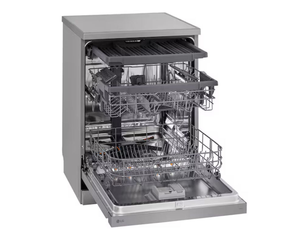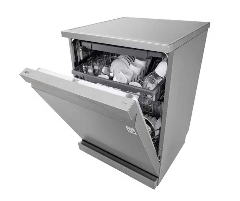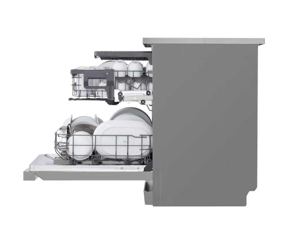 The LG DFC533FV Free-Standing Dishwasher is a premium 14-place-setting dishwasher ideal for families and modern kitchens. It combines QuadWash™ — four multi-directional spray arms for full-coverage cleaning — with TrueSteam™ steam-enhanced wash cycles to tackle stubborn food residue and reduce water spots for sparkling dishes. Its EasyRack™ Plus adjustable racks and a third rack maximize loading flexibility, while the Inverter Direct Drive motor ensures efficient, quiet, and durable performance. Smart-home convenience comes from Wi-Fi control via LG ThinQ™, allowing remote monitoring, cycle downloads, and smart diagnosis.